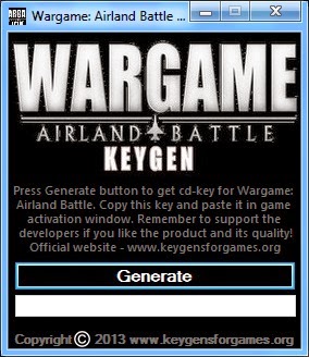 After that open Wargame Airland Battle Key Generator and click Generate button to get your Wargame Airland Battle Key. Here is the only place where you can download Wargame Airland Battle Serial Number for free. Every Wargame Airland Battle activation code is working for PC version of the game. You don't need Crack for Wargame Airland Battle IF you Download this Wargame Airland Battle Keygen! Download Wargame Airland Battle cd key generator for free and play in Cracked SWargame Airland Battle.