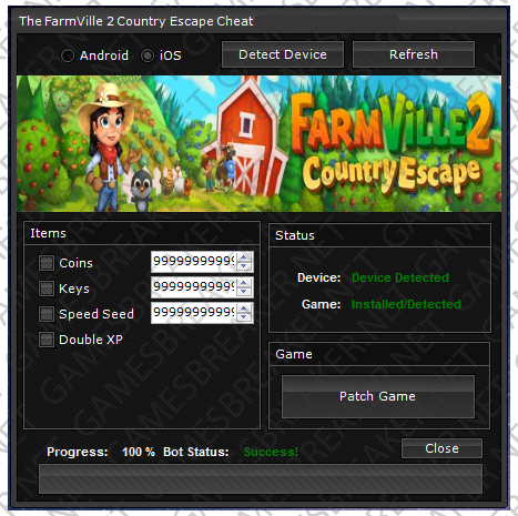 How to Use Farm Heroes Saga Hack Tool: Download the Farm Heroes Saga Hack Tool bellow. Connect your Android or iOS device(skip this step for facebook version) to your PC via USB (you must have the game already installed) Open the hack tool and click Detect Device button. Select your features and enter their values. Last one – click the Patch Game button, it will automatically update the game. Enjoy your hack!